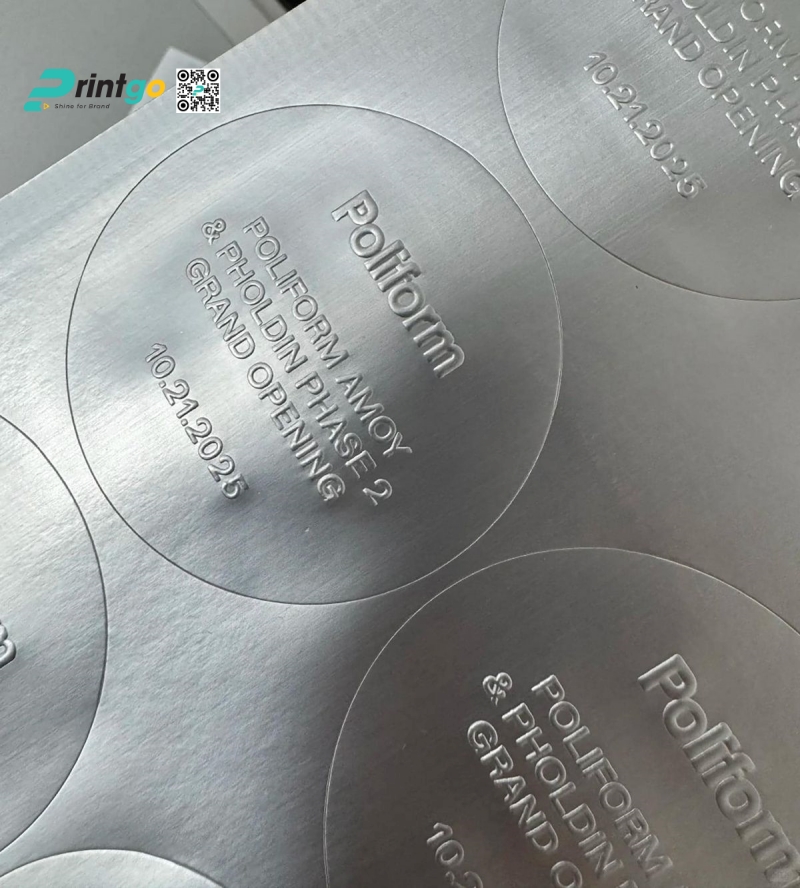 Ép kim (ép nhũ) : Gia tăng hiệu ứng ánh kim, tạo điểm nhấn sang trọng và nâng cao tính nhận diện thương hiệu trên nền tem bạc.