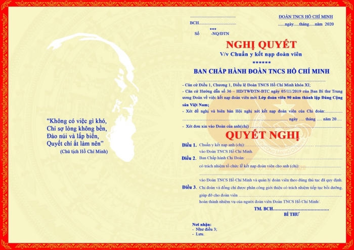 Chuyển hồ sơ lên Đoàn cấp trên: Nếu được chi đoàn đồng ý, hồ sơ của thanh niên sẽ được chuyển lên Ban Chấp hành Đoàn cấp trên trực tiếp để xem xét và ra quyết định chuẩn y kết nạp.