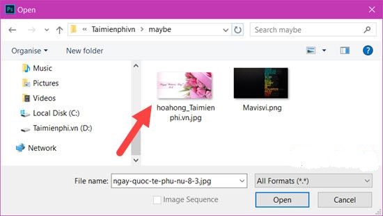 Bước 2: Lựa chọn đến nơi chứa ảnh rồi nhấn Open để mở bức ảnh đó. Bức ảnh đã hiện ra, bây giờ chúng ta cùng nhau làm thiệp 20-10 đẹp bằng Photoshop trên bức ảnh này.