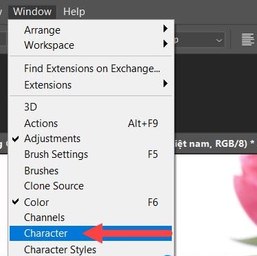 Bước 6: Để làm được điều đó bạn cần phải click vào menu Windows > chọn Character để mở nó ra.