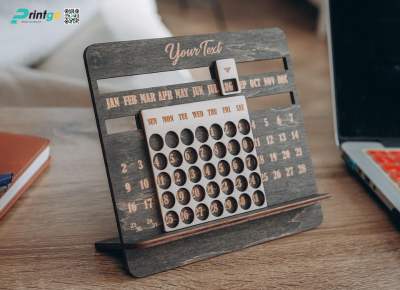 - Gỗ (MDF hoặc gỗ tự nhiên): Mang lại cảm giác bền vững và sang trọng, phù hợp các mẫu lịch cao cấp, quà tặng VIP. Có thể khắc laser logo, phủ sơn mịn hoặc in họa tiết để tăng giá trị nhận diện thương hiệu.