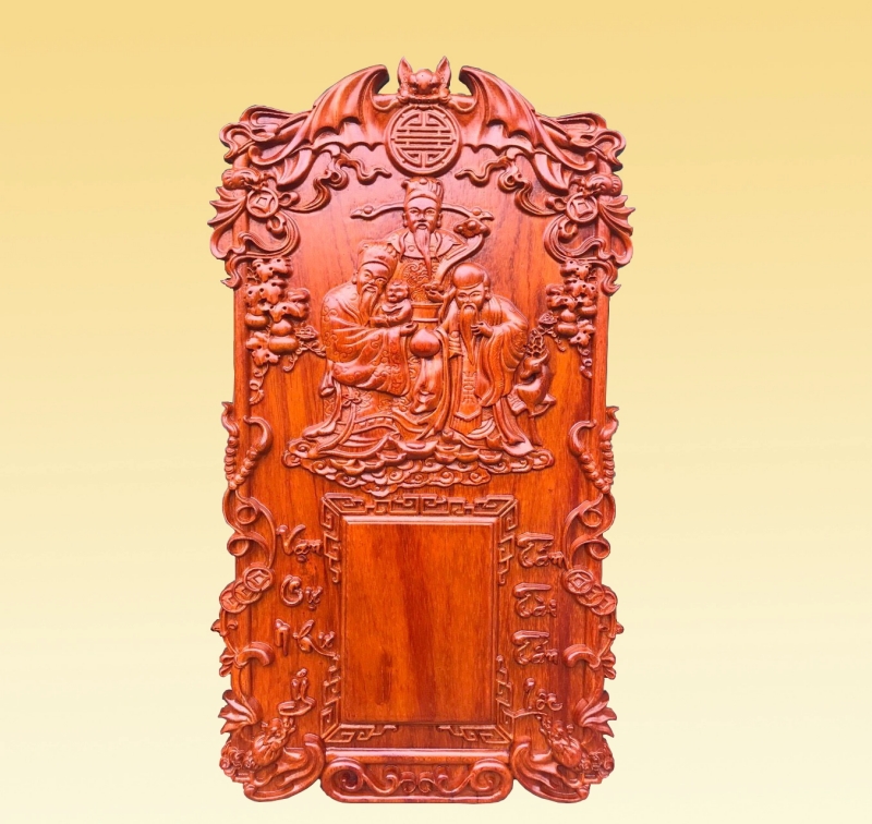 Khi phôi gỗ được chuẩn bị xong, Printgo tiến hành gia công bề mặt bằng máy chà nhám công nghiệp, đảm bảo mặt gỗ phẳng, mịn và không tì vết. Tiếp đó, hình ảnh ba vị thần Phúc – Lộc – Thọ cùng các hoa văn trang trí được khắc chạm bằng công nghệ CNC hoặc laser hiện đại, cho đường nét chính xác và sắc sảo đến từng chi tiết. Nhờ quy trình này, phần tranh gỗ đạt hiệu ứng nổi – chìm tinh tế, tôn lên vẻ đẹp nghệ thuật và chiều sâu cho toàn bộ sản phẩm.