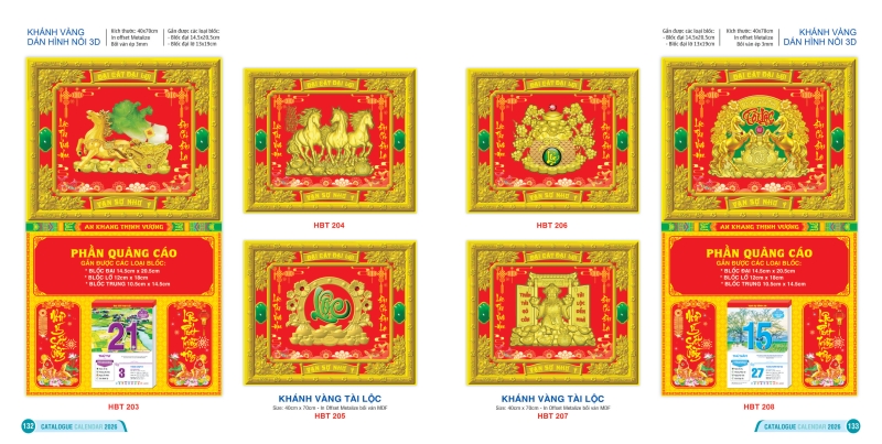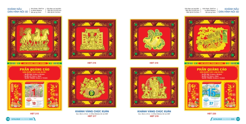 Khánh lịch Hai Bà Trưng được xem là điểm nhấn quan trọng, nơi thể hiện sự sang trọng và đẳng cấp của cả bộ lịch. Không đơn thuần là khung gắn bloc, khánh lịch còn đóng vai trò như một “bức tranh nghệ thuật” treo tường, làm nổi bật vẻ đẹp tổng thể của cuốn lịch và mang lại cảm giác ấm áp, trang nghiêm cho không gian sống. Đặc biệt, khánh lịch Hai Bà Trưng còn thể hiện sự đa dụng khi có thể gắn được nhiều kích thước bloc khác nhau, đáp ứng nhu cầu đa dạng của người dùng.