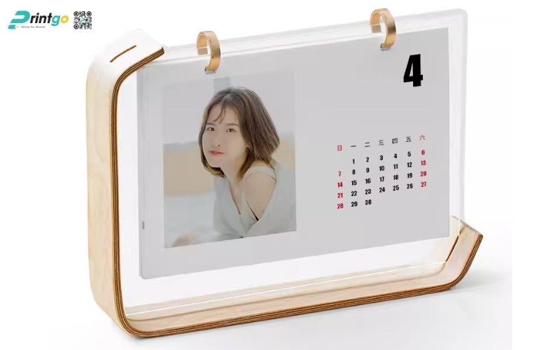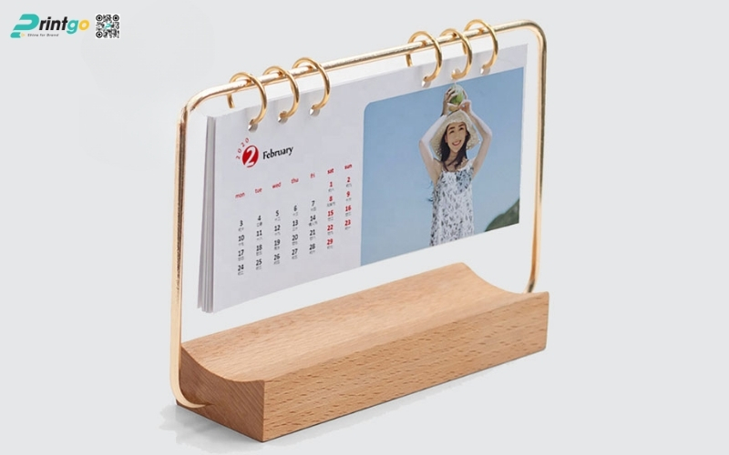 Điểm nổi bật của mẫu lịch này nằm ở phần khung kim loại sáng bóng kết hợp cùng đế gỗ tự nhiên mang đến cảm giác ấm áp, gần gũi nhưng không kém phần tinh tế. Bên cạnh đó, bề mặt đế gỗ có thể khắc laser logo thương hiệu hoặc thông điệp chúc Tết, giúp món quà trở nên đặc biệt và mang đậm dấu ấn doanh nghiệp.