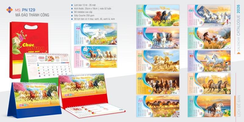 Mỗi dịp năm mới, người Việt thường trao nhau những món quà mang lời chúc cát tường. Trong đó, lịch Mã Đáo Thành Công nổi bật với hình ảnh tám chú ngựa tung vó phi nước đại – biểu trưng cho sự bứt phá, đoàn kết và thành công rực rỡ. Không chỉ là vật phẩm xem ngày, đây còn là ấn phẩm phong thủy gửi gắm niềm tin vào một năm mới “thuận buồm xuôi gió, mã đáo thành công”. Cùng Printgo khám phá ý nghĩa, ưu điểm cũng như gợi ý phương án gia công cho lịch Mã Đáo Thành Công nhé trong bài viết dưới đây nhé!