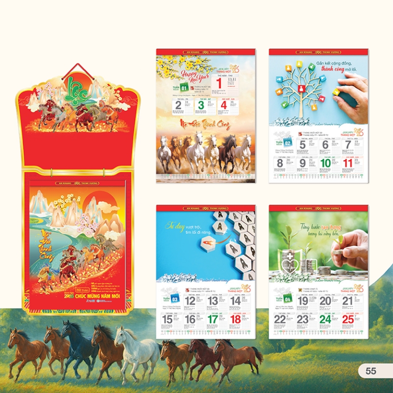 Thiết kế đa dạng, sáng tạo: Mỗi mẫu lịch được phát triển theo câu chuyện và tinh thần thương hiệu, kết hợp yếu tố phong thủy và mỹ thuật để truyền tải thông điệp Tết ý nghĩa.