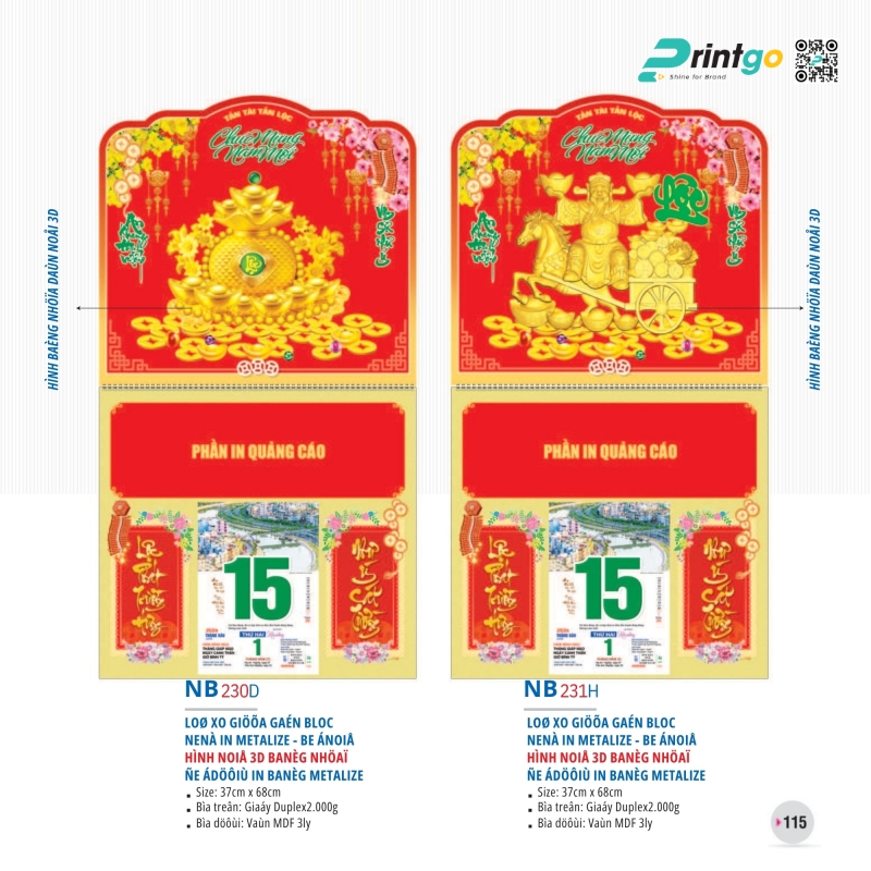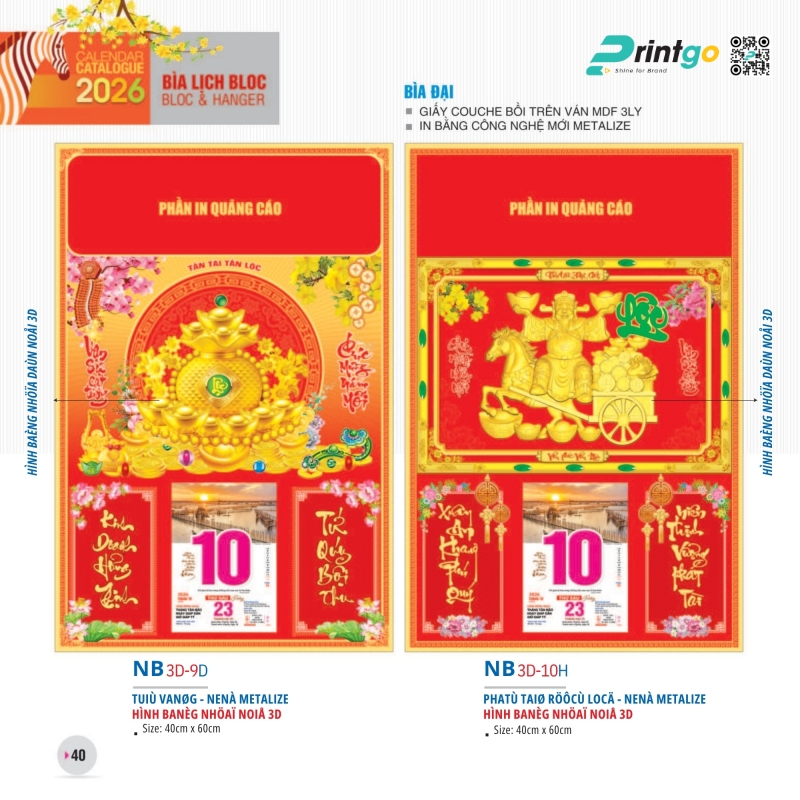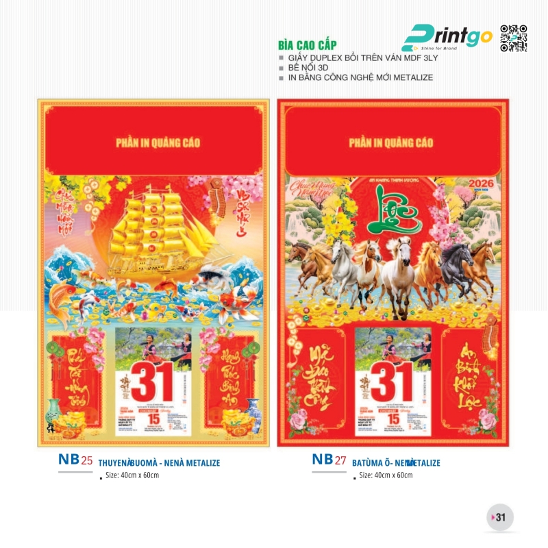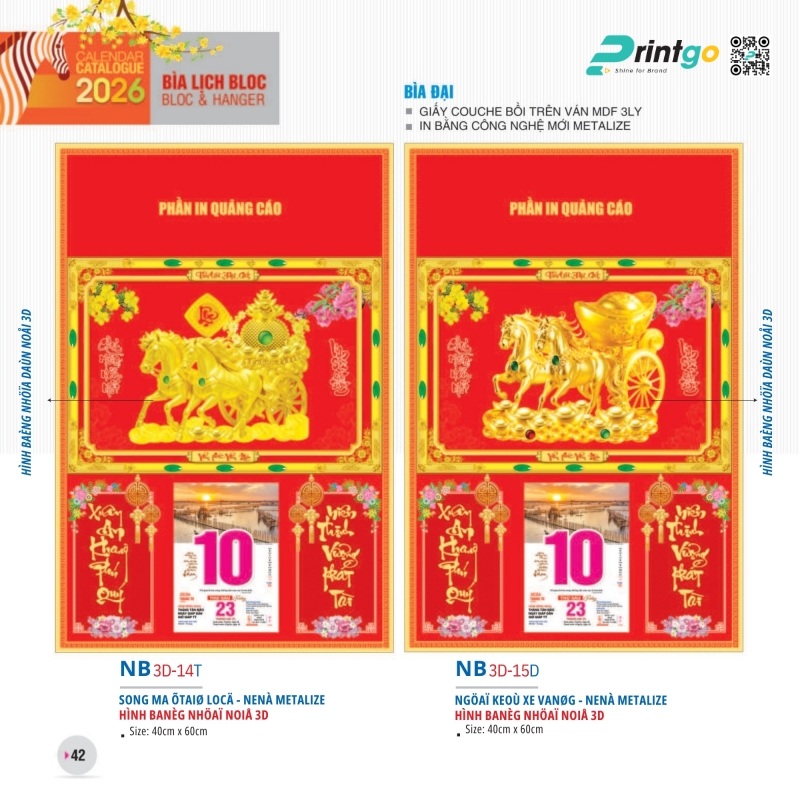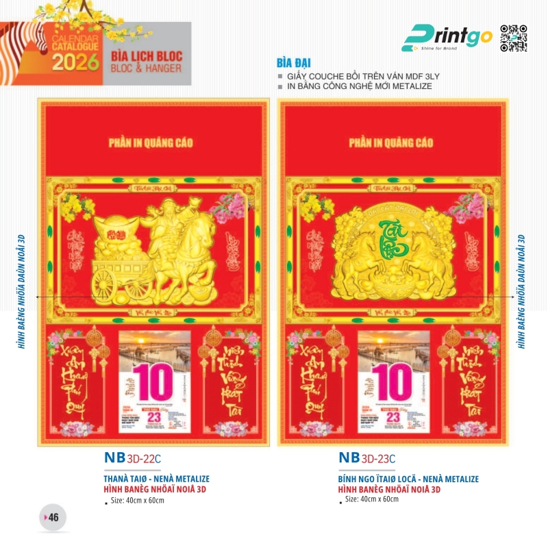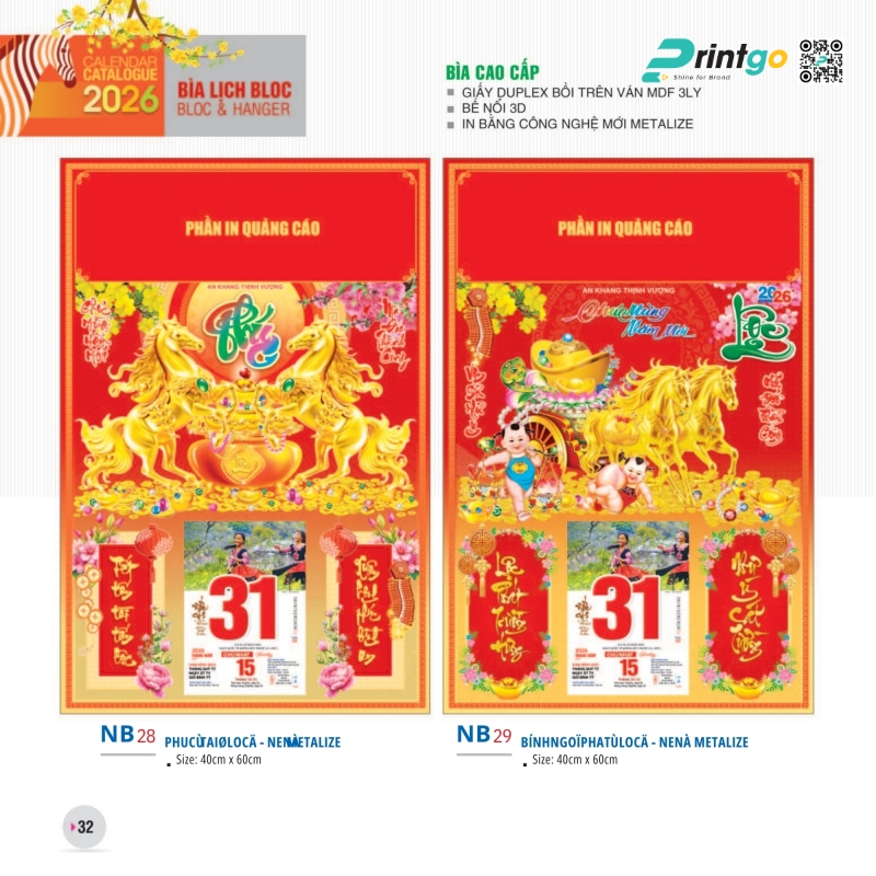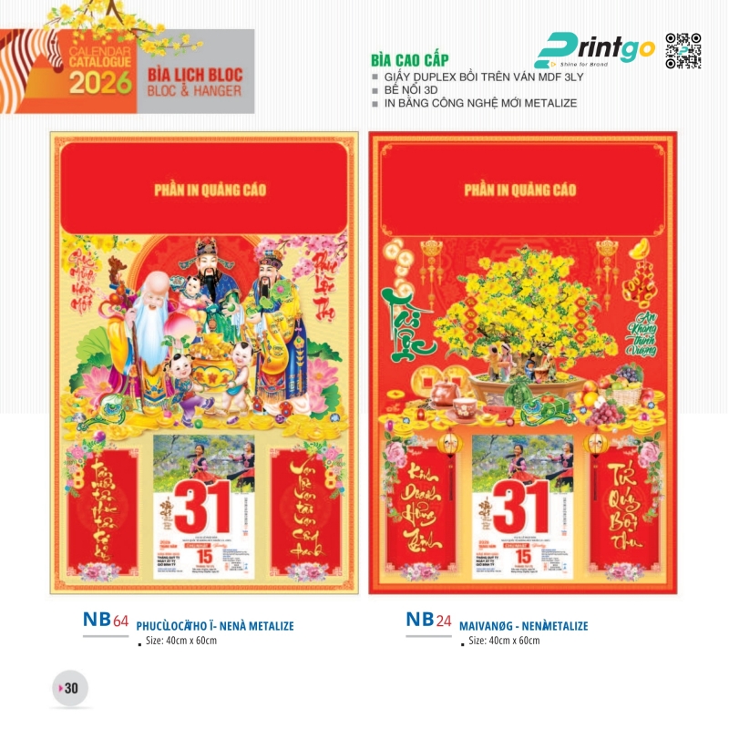 Bìa lịch: Giấy Couche bồi trên ván MDF 2.5ly – 3ly, in Metalize ánh kim sang trọng