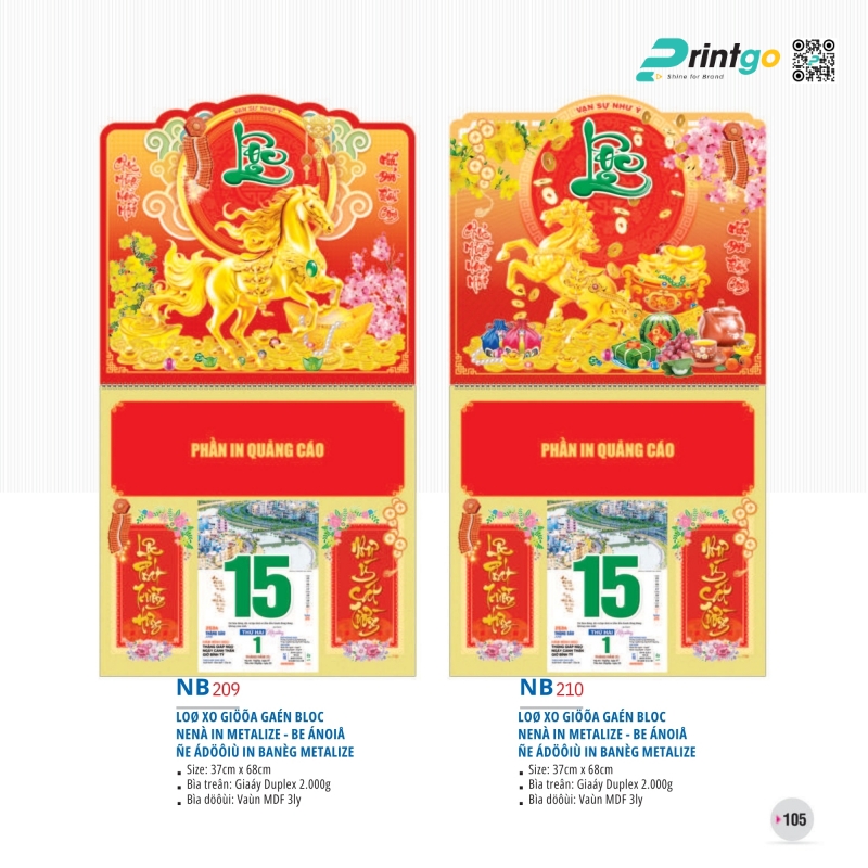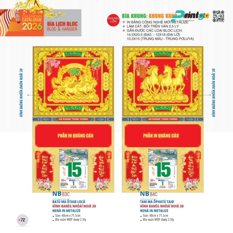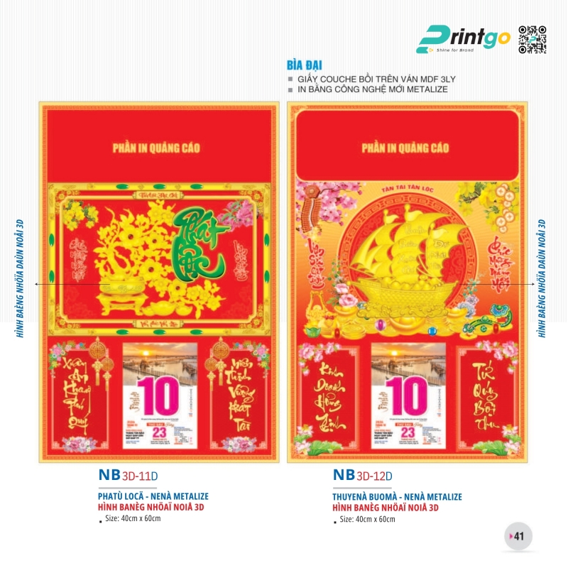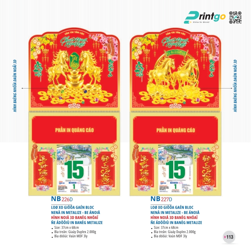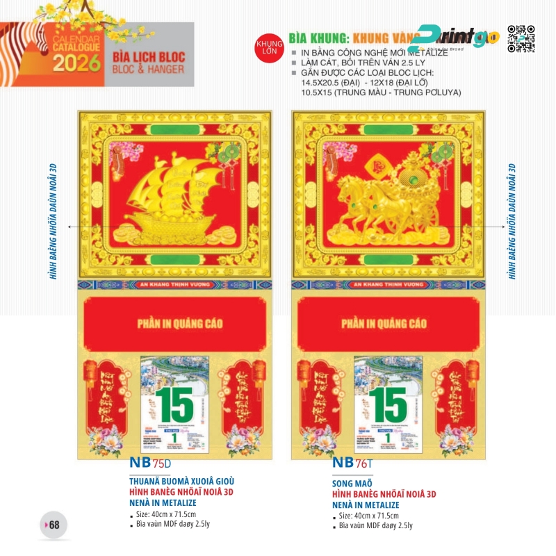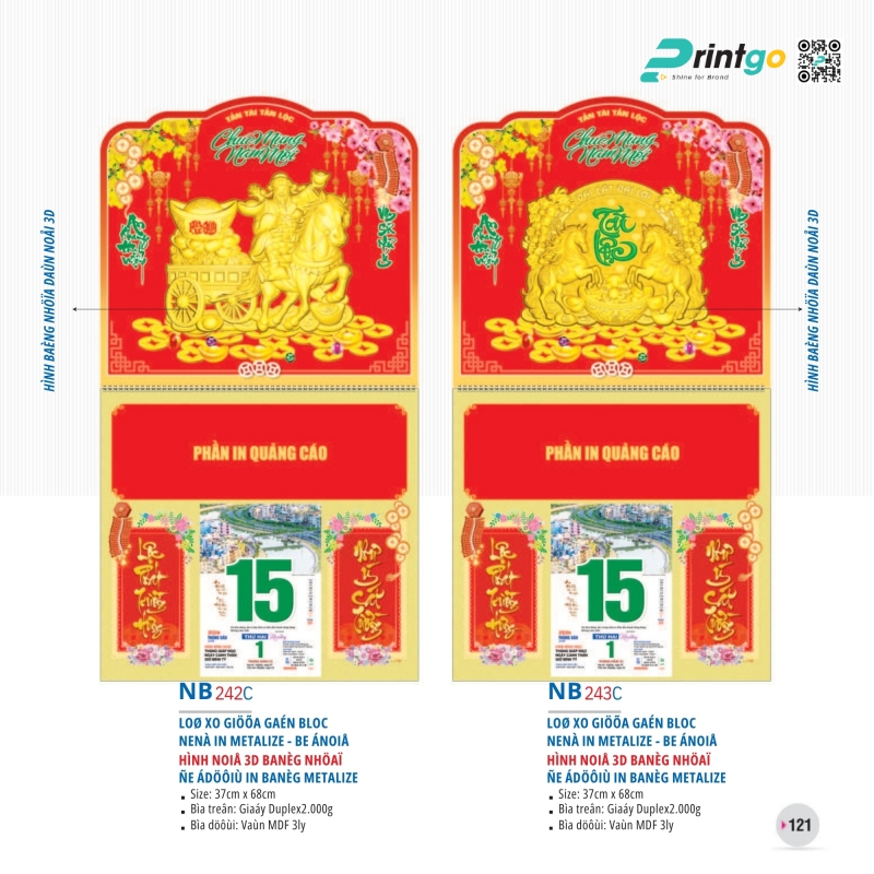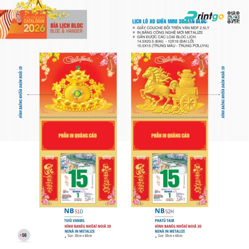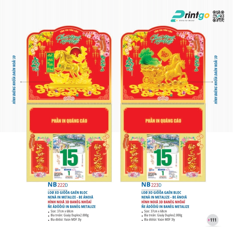 Bìa lịch: Giấy Couche bồi trên ván MDF 2.5ly – 3ly, in Metalize ánh kim sang trọng