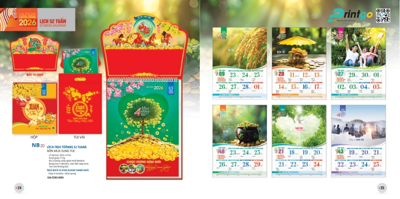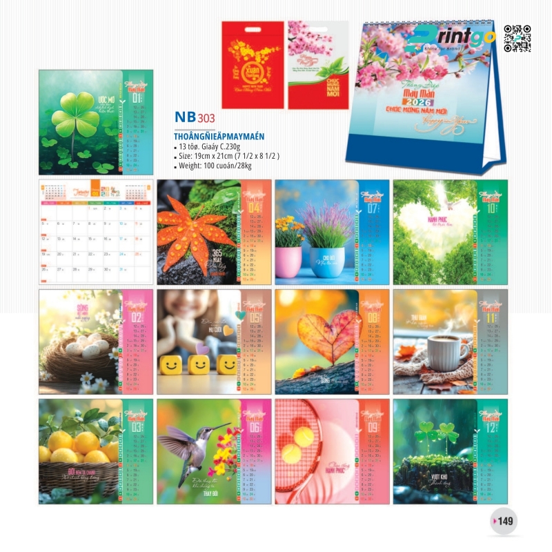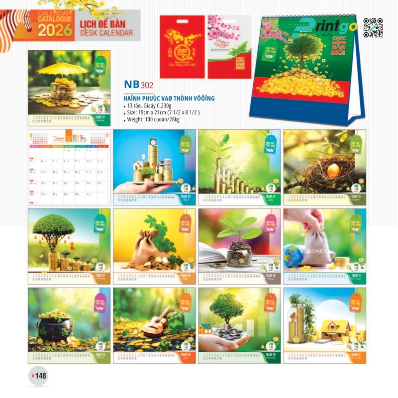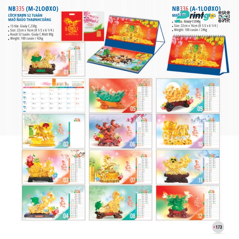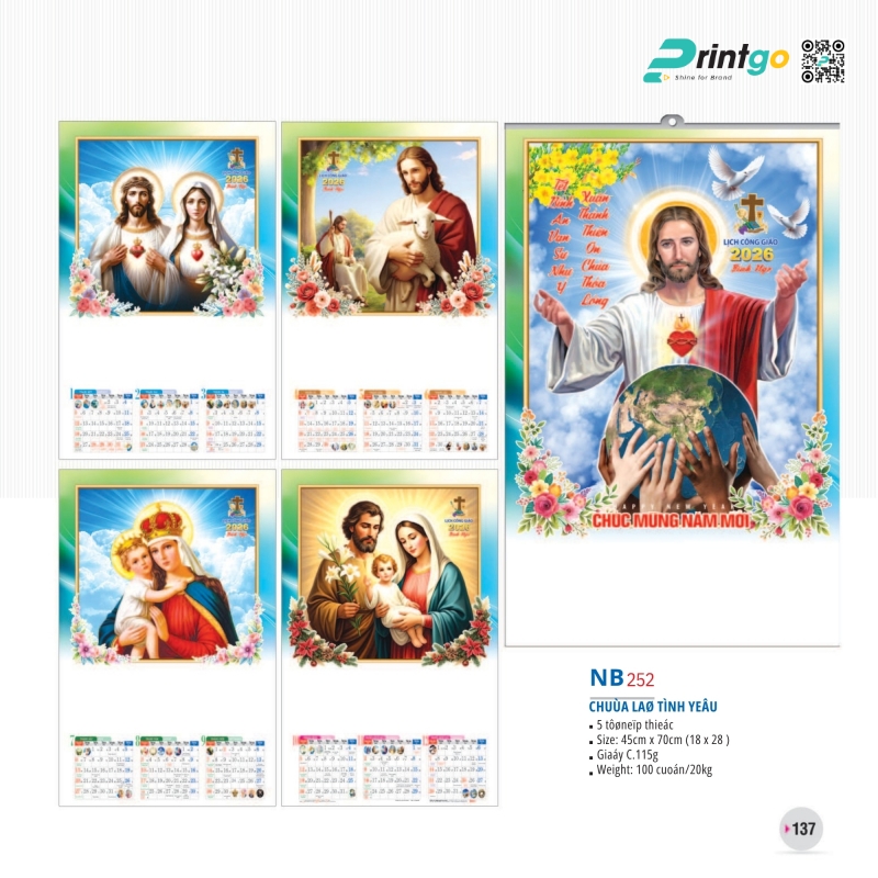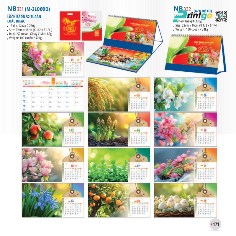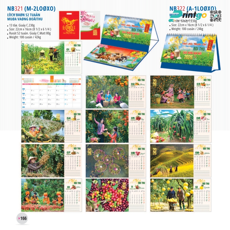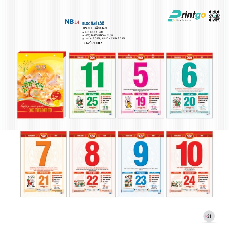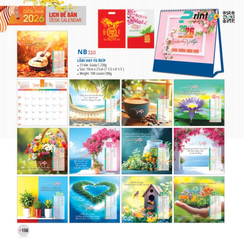 Số tờ: 13 tờ hoặc 52 tuần, in trên giấy Couche 200gsm – 230gsm cao cấp.