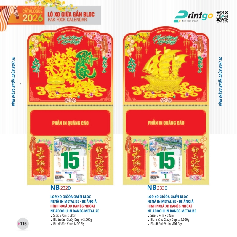 Phụ kiện hình nổi 3D chính là điểm nhấn đặc sắc, nâng tầm sự sang trọng và ấn tượng cho bộ lịch Tao Đàn 2026. Với sự đa dạng trong các biểu tượng phong thủy như Phúc – Lộc – Thọ, Thuyền Buồm, Mã Đáo Thành Công, Thần Tài hay Hoa Mai, mỗi chi tiết đều được thiết kế tinh xảo, truyền tải trọn vẹn thông điệp về may mắn, tài lộc và thịnh vượng. Nhờ vào ánh vàng rực rỡ và kỹ thuật chế tác công phu, những phụ kiện này không chỉ làm đẹp cho bìa lịch mà còn biến lịch Tao Đàn trở thành một món quà Tết cao cấp, thể hiện giá trị tri ân sâu sắc dành cho gia đình, khách hàng và đối tác.