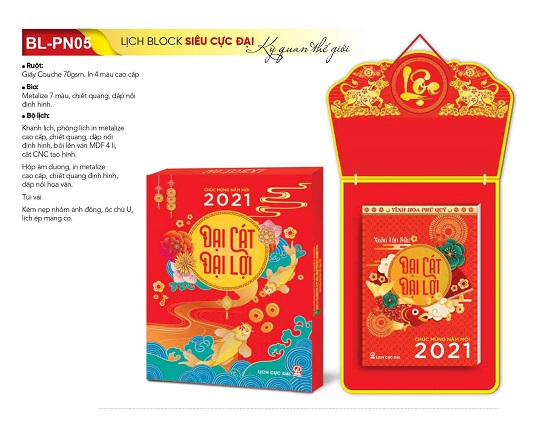 - Phần bộ lịch: Khánh lịch và phông lịch in Metalize cao cấp, chiết quang, bồi ván MDF 4 li, dập nổi 3D, cắt CNC tạo hình. Bộ lịch kèm nẹp nhôm ánh đồng, ốc chữ U. Ngoài ra, còn có túi vải và hộp âm dương in 4 màu để bảo quản mẫu lịch một cách tốt nhất