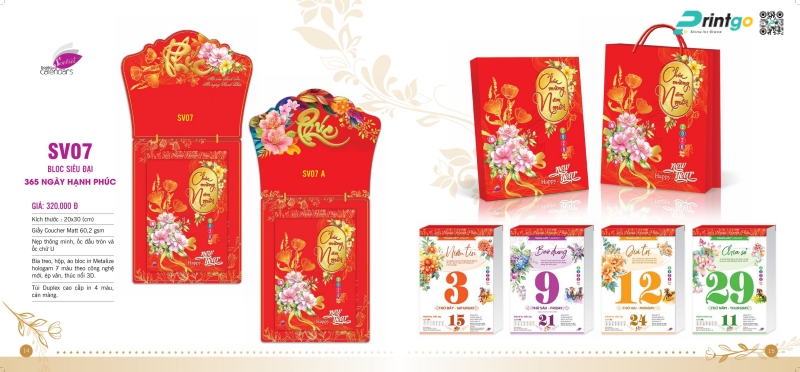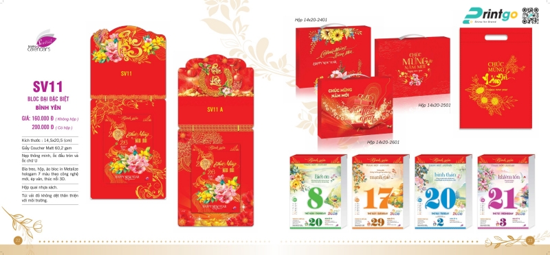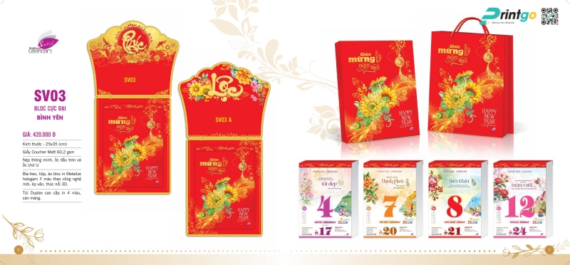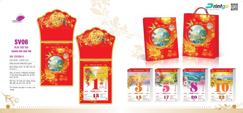 Bên cạnh những mẫu lịch sang trọng, Sen Việt còn mang đến dòng sản phẩm túi giấy đựng lịch tiện lợi, góp phần hoàn thiện trọn vẹn giá trị món quà Tết. Các mẫu túi được thiết kế đồng bộ với phong cách của bộ sưu tập lịch, sử dụng gam màu đỏ, vàng, cam chủ đạo kết hợp cùng hoa văn mai đào, hoa sen, chim én… tạo nên diện mạo nổi bật, sang trọng. Túi giấy không chỉ giúp bảo vệ lịch tết Sen Việt trong quá trình di chuyển, mà còn tăng thêm tính thẩm mỹ, biến bộ lịch trở thành món quà tri ân ý nghĩa gửi đến khách hàng, đối tác hay người thân.