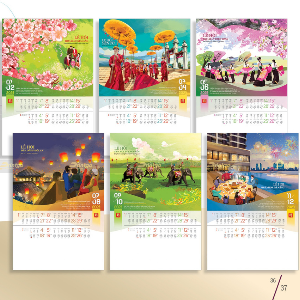 Lịch Tết không chỉ có tác dụng để xem ngày tháng, mà trong mỗi cuốn lịch lại mang theo những chủ đề khác nhau, cùng với những hình ảnh sống động, làm nức lòng người xem. Ấn phẩm lịch treo tường Âm vang Lễ hội Ba miền LTT-BS0523 với một chủ đề đầy sắc màu, không khí nhộn nhịp, rực rỡ sẽ làm bạn vô cùng hài lòng.