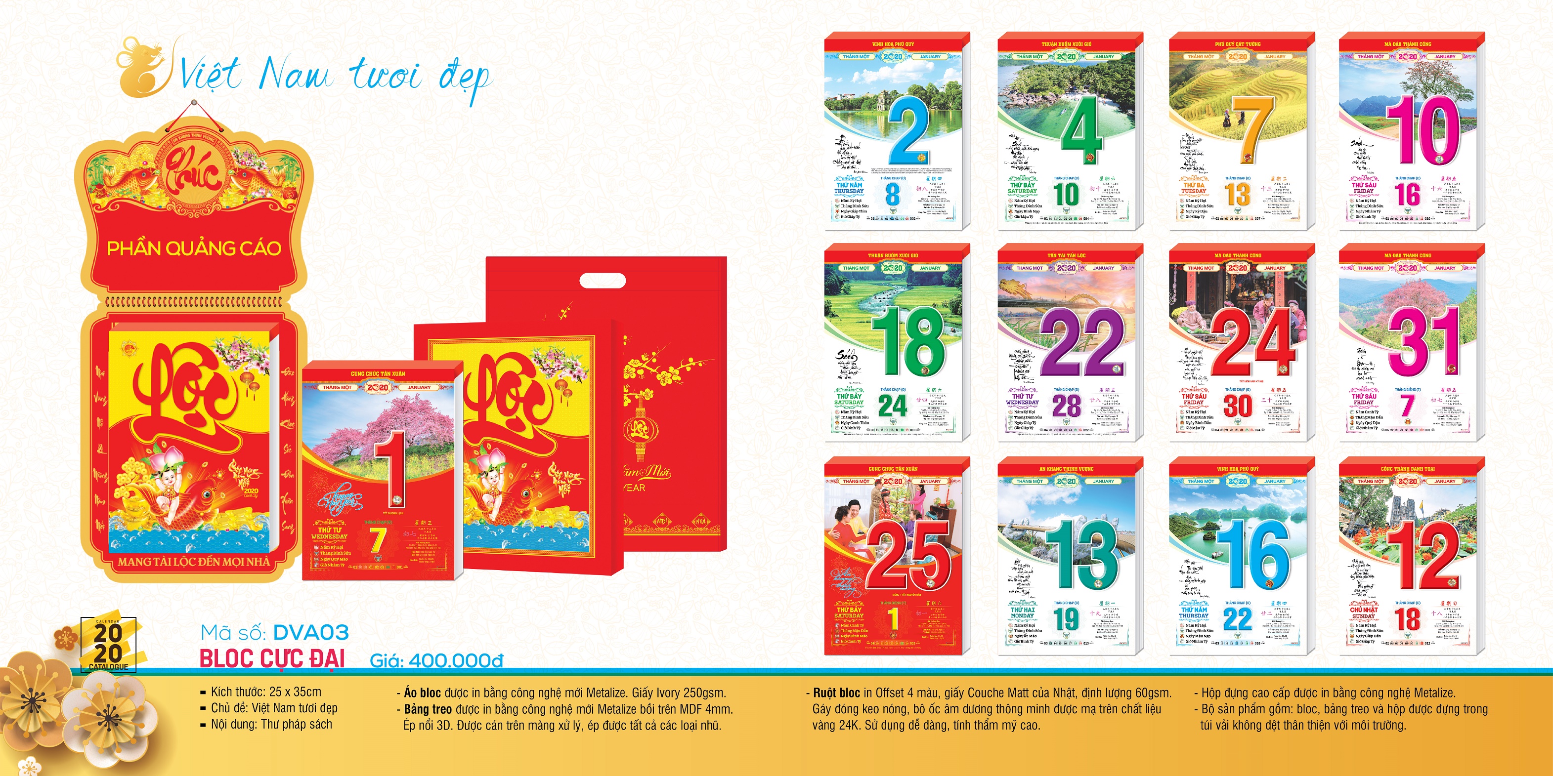 Mẫu lịch KVP-DVA 03 với chủ đề chính là Việt Nam tươi đẹp đem đến cho người xem cảm giác tò mò, muốn khám phá. Bên cạnh đó, mẫu lịch còn sử dụng các họa tiết mảnh, bay bổng, font chữ của KVP-DAV 03 cũng vô cùng thu hút nhờ sự mềm mại trong đường nét. Tuy nhiều hình ảnh được kết hợp, đan xen vào nhau nhưng bố cục trình bày của sản phẩm vẫn vô cùng rõ ràng, đầy đủ thông tin cần thiết và kết hợp thêm các ô trống dành cho nhu cầu ghi chú. Một cuốn lịch như trên thật đa năng, vừa có thể như một bức họa trang trí cho nội thất thêm nổi bật, lại còn có thể theo dõi mốc thời gian.