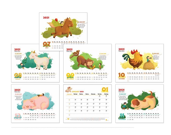 - Loại lịch: Lịch 13 tờ, trong đó có 1 tờ bìa và 12 tờ ruột tương ứng với 12 tháng trong năm. Tờ bìa lịch là hình vẽ con trâu – con giáp năm Tân Sửu. Còn mỗi tờ ruột được in 2 mặt có đầy đủ ngày tháng năm và có vẽ 1 con giáp theo thứ tự.