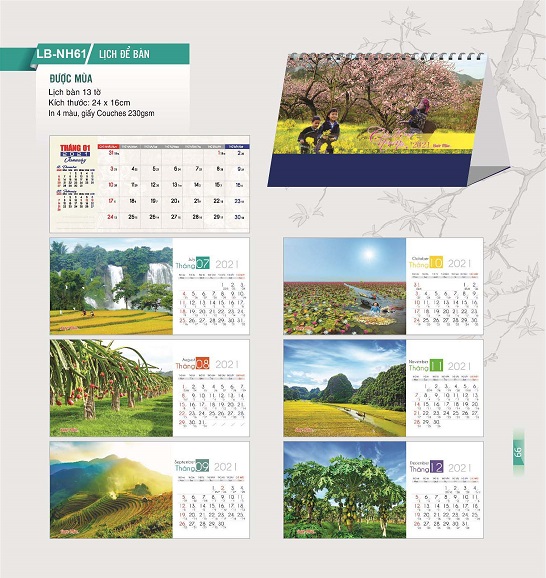 Mẫu lịch để bàn “Được mùa” LB-NH60 mang bao khát vọng về một năm mới mưa thuận gió hòa, mùa màng bội thu, cuộc sống no đủ của những người nông dân trên khắp mọi miền tổ quốc. Đó cũng chính là lời chúc năm mới viên mãn, đủ đầy, ấm no mà chúng tôi muốn gửi tới tất cả quý khách hàng nhân dịp tết đến xuân về. Với ý nghĩa đó, mẫu lịch sẽ là một món quà năm mới thích hợp để các cơ quan, tổ chức, doanh nghiệp tặng tri ân đối tác, khách hàng, nhân viên. Ngoài ra, bất kì khách hàng nào có nhu cầu mua lịch để bàn cho năm mới đều có thể sử dụng mẫu lịch “Được mùa” tinh tế và ý nghĩa này.