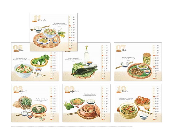 Mẫu lịch để bàn “Món ngon quê nhà” LB-PN10 chắt lọc những món ăn cổ truyền tinh túy mà gần gũi, thân thương giữa vô vàn những món ngon của người Việt như: cá kho, canh chua, canh rau đắng,… Những món ăn thấm đẫm tinh hoa văn hóa, bản sắc dân tộc và quen thuộc trong mỗi bữa ăn hàng ngày của người Việt. Bộ lịch nhỏ bé nhưng mang cả hương vị của quê hương và hình ảnh bàn tay khéo léo của người bà, người mẹ, người vợ đặt cả yêu thương vào từng món ngon đó. Mẫu lịch cũng gửi gắm hi vọng về một mùa tết hội tụ, sum vầy, mỗi chúng ta dù đi đâu làm đâu, cũng hãy dành chút thời gian ngày tết về quây quần bên bữa cơm gia đình đầm ấm.