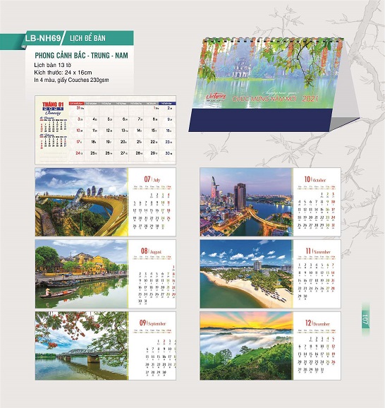 Đất nước Việt Nam ta đi khắp 3 miền đâu đâu cũng có những phong cảnh đẹp. Từ biển khơi, hải đảo đến núi rừng đồi cây xanh mướt; từ những khung cảnh thiên nhiên hùng vĩ đến những di tích lịch sử, văn hóa; từ kiến trúc truyền thống đến những công trình hiện đại, cả những di sản được UNESCO công nhận, đều được lưu lại bằng những thước hình thực tế nhất. Lật giở mỗi trang lịch là được tham quan, khám phá một miền đất, một địa danh tuyệt đẹp và thú vị. Với chủ đề “Phong cảnh Bắc Trung Nam”, mẫu lịch để bàn LB-NH68 hy vọng, năm mới mỗi chúng ta sẽ có cơ hội được du lịch và ngắm nhìn ngắm nhìn những phong cảnh tuyệt mỹ này.