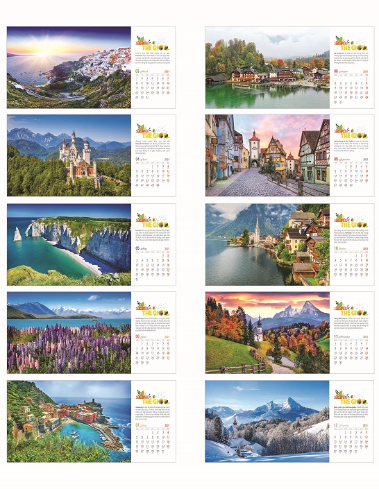 Mẫu lịch để bàn LB-AH81 – “Sắc màu thế giới” lấy cảm hứng từ những miền đất, địa danh với những khung cảnh thiên nhiên tươi đẹp, có núi, có rừng, có biển, cùng những công trình kiến trúc đồ sộ có giá trị hàng trăm, hàng ngàn năm tuổi. Nhiều khung hình nhỏ cùng ghép lại tạo nên một bức tranh thế giới lớn nhiều màu sắc và đầy ấn tượng.