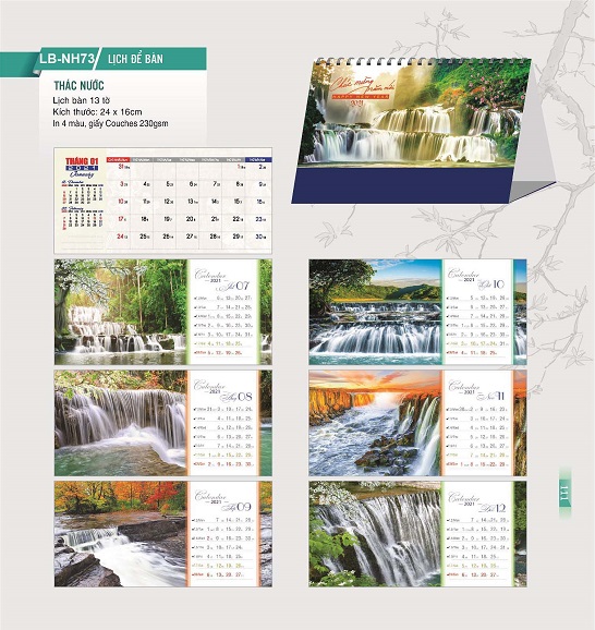 Mẫu lịch để bàn “Thác nước” LB-NH72 với những hình ảnh thác nước đẹp mang ý nghĩa phong thủy, giúp điều hòa vận khí cho không gian sống giữa những thiết bị công nghệ hiện đại. Người Việt có câu “Tiền vào như nước” trùng với quan niệm phong thủy “Thủy quản tài lộc” (ý nói ở gần nước thì tài lộc phú quý). Vì vậy, nước được coi là yếu tố tích cực, quan trọng đem lại tài lộc, sinh khí và may mắn cho gia chủ. Ngoài ra, dòng chảy của thác nước cũng mang ý nghĩa biểu tượng cho sự suôn sẻ, may mắn mọi điều trong cuộc sống. Qua đó, mẫu lịch gửi gắm lời chúc năm mới phát tài phát lộc, vạn sự cát tường, thành công trên mọi bước đường.