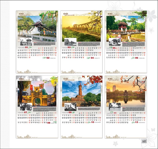 Mảnh đất Kinh Kỳ hơn 1000 năm hào hoa và hào hùng mang trong mình bề dày giá trị lịch sử, văn hóa gắn liền với các di tích, công trình kiến trúc như: Chùa Một Cột, cầu Long Biên, Ô Quan Chưởng,… Trải qua bao thăng trầm của lịch sử, bao đổi thay của thời gian, những di sản ấy vẫn kiêu hùng sức sống mãnh liệt giữa chốn đô thị hào nhoáng, xô bồ, được chứng minh qua sự thay đổi màu sắc của những tấm ảnh, sắc ảnh đen trắng – Hà Nội xưa, sắc ảnh màu – Hà Nội nay. Với những ý nghĩa đó, mẫu lịch treo tường 7 tờ “Di sản Hà Nội” TT-MTV121 chứa đựng bao niềm yêu mến và tự hào về mảnh đất thủ đô ngàn năm văn hiến.