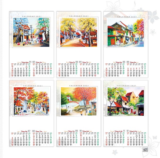 Mẫu lịch treo tường 7 tờ “Góc phố Hà Nội” TT-MTV123 gợi lại cho chúng ta những góc phố thân quen gắn bó với những người con của Hà Nội xưa. Những hình ảnh trên đường phố ngày ấy là tà áo dài trắng tinh khôi thướt tha trên từng con phố, là tiếng xích lô chuông xe leng keng hòa cùng tiếng hàng rong của bà, của mẹ, là 5 cửa ô đã trở thành niềm tự hào của biết bao thế hệ người Hà Nội. Tất cả được tái hiện đến từng chi tiết nhỏ nhất một cách chân thực và sống động qua từng bức ảnh, gợi cho người xem tâm trạng nao nao, tiếc nuối bởi cái hồn rất riêng của Hà Nội xưa