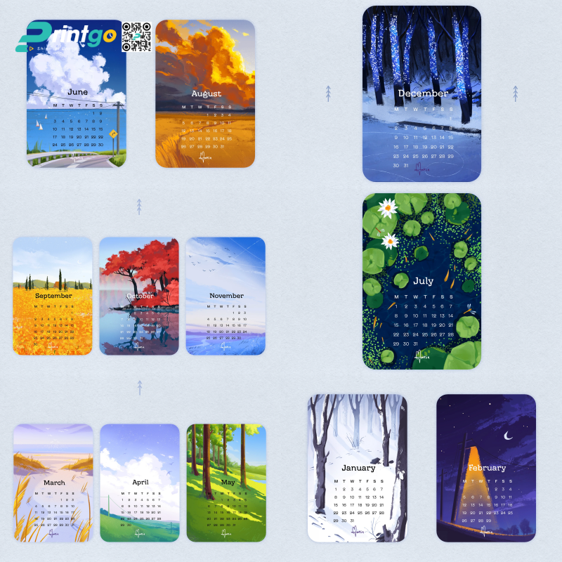 Thiết kế của mẫu lịch lấy cảm hứng sâu sắc từ vẻ đẹp bốn mùa thiên nhiên, được tái hiện tinh tế qua từng gam màu và khung cảnh đặc trưng của mỗi tháng. Tông màu được phối theo hướng nhẹ nhàng, giàu cảm xúc, mang đến cảm giác thư giãn và gần gũi khi sử dụng. Đặc biệt, hình ảnh minh họa mang đậm phong cách hội họa, sử dụng các nét cọ mềm và bố cục cân đối, tạo cảm giác như người dùng đang chiêm ngưỡng một chuỗi tác phẩm nghệ thuật thu nhỏ. Nhờ vậy, mỗi trang lịch không chỉ là một lát cắt của thời gian mà còn gợi nhắc người xem về nhịp sống chậm rãi, trọn vẹn và đầy cảm hứng, đặc biệt phù hợp với những ai yêu thích nghệ thuật và mong muốn mang hơi thở thiên nhiên vào không gian làm việc.