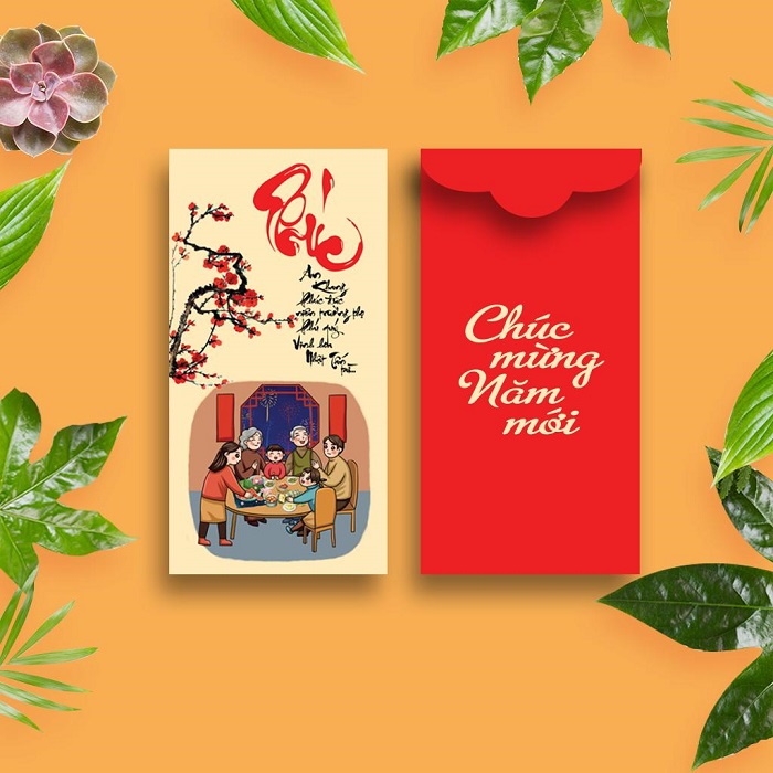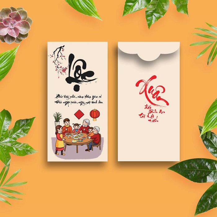 Mẫu lì xì LXT-14 có thiết kế rất gần gũi và quen thuộc với đời sống thường nhật, minh họa chủ đạo cho mẫu lì xì là hình ảnh bữa cơm sum vầy ấm cúng bên các thành viên gia đình. Màu sắc tươi sáng bắt mắt với tông vàng đỏ chủ đạo mang đậm đà bản sắc Tết, phù hợp với mọi lứa tuổi và đối tượng khách hàng.