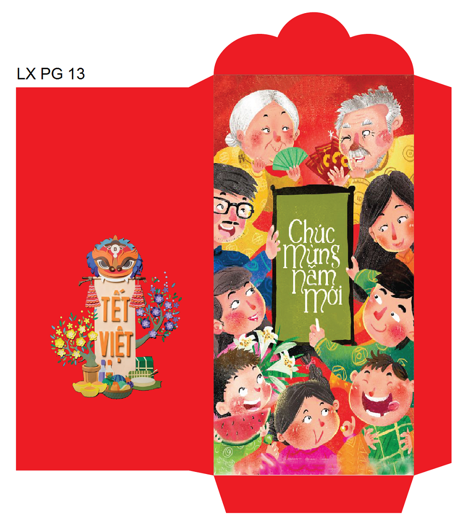 Mẫu lì xì LX PG 13 lấy tông màu chủ đạo là màu đỏ truyền thống, thể hiện sự may mắn trong năm mới. Điểm khiến sản phẩm trở nên bật hơn là hình ảnh rất quen thuộc mỗi dịp tết đến xuân về, đó là hình ảnh gia đình quây quần, cười nói vui vẻ bên nhau. Tất cả đều tạo nên một bao lì xì trở nên gần gũi và thu hút trong mắt người tiêu dùng Việt. Một sản phẩm như vậy chắc chắn các thương nhân nên sở hữu nó để kinh doanh trong gian hàng nhà mình.