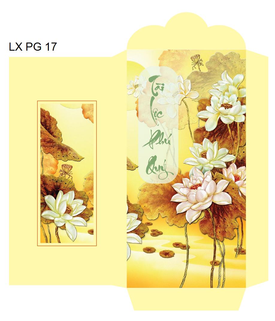 Mẫu lì xì LX PG 17 là mẫu thiết kế đang khá hot để chuẩn bị cho dịp xuân Canh Tý sắp tới , lấy màu vàng làm màu chủ đạo đi kèm theo dòng chữ "tài lộc phú quý", một lời chúc tài lộc khiến cho sản phẩm trở nên nổi bật hơn, nhưng điểm nhấn chính trên mẫu lì xì LX PG 17 đó chính là những bông hoa sen, "quốc hoa" của đất nước Việt Nam ta, nó khiến cho gần gũi và thân thuộc với khách hàng hơn bao giờ hết. Một mẫu sản phẩm với thiết kế tuyệt vời như vậy chắc hẳn sẽ rất được ưa chuộng trong những phiên chợ tết sắp tới, các doanh nhân còn chần chừ gì nữa mà không sở hữu cho mình một trong những sản phẩm có thể chiếm lĩnh thị trường lì xì tết 2020 này nhỉ.