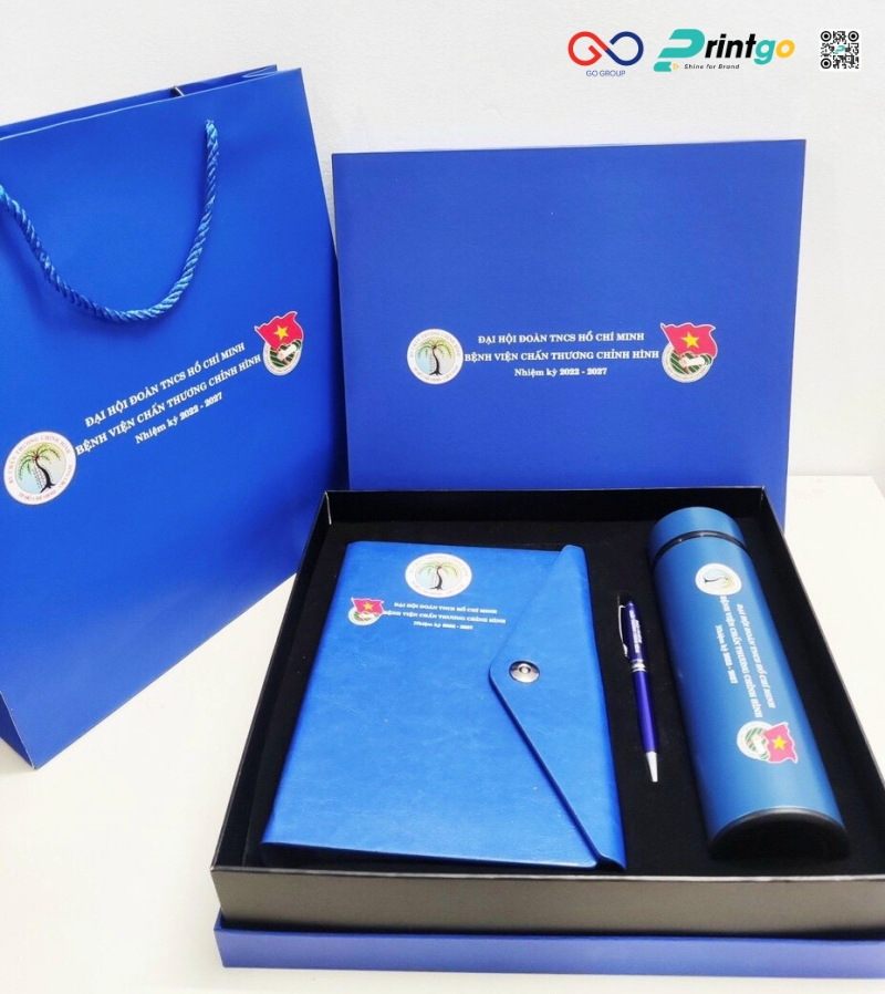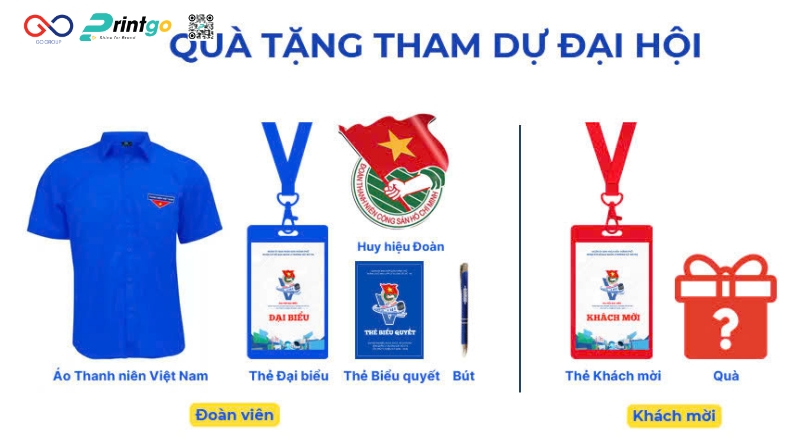 - Quà tặng và Vật phẩm lưu niệm: Logo được in hoặc khắc tinh xảo trên Kỷ niệm chương, Đồng phục (áo Đoàn, nón) và các phụ kiện quà tặng, không chỉ giúp lưu giữ giá trị tinh thần mà còn biến mỗi vật phẩm thành một "sứ giả" quảng bá hình ảnh tổ chức.