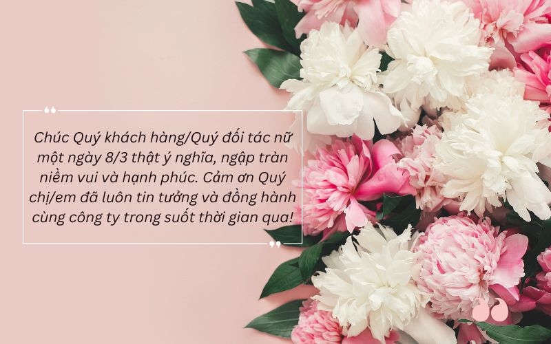 3. Nhân ngày 8/3, [Tên công ty] xin chân thành cảm ơn Quý đối tác đã luôn sát cánh cùng chúng tôi trong mọi giai đoạn phát triển. Kính chúc Quý vị sức khỏe dồi dào, hạnh phúc và tiếp tục giữ vững vị thế của mình trên thị trường.