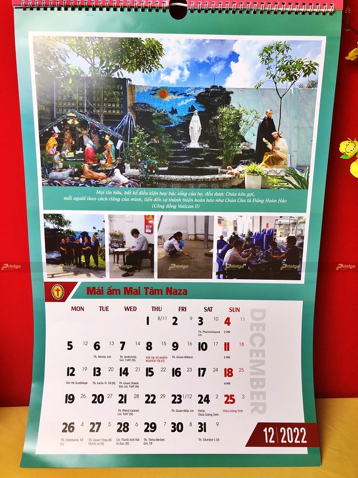 Phần còn lại là cung cấp những thông tin cần thiết về ngày, tháng, năm. Điểm nhấn của cuốn lịch tết treo tường Mai Tâm là ngoài ghi chú những dịp kỷ niệm, lễ tết như bao thiết kế lịch khác, thì nó còn note lại từng ngày lễ quan trọng của đạo theo từng tháng, giúp các giáo dân có thể dễ dàng ghi nhớ. Chỉ với 7 tờ lịch với thiết kế truyền tải thông điệp ý nghĩa chắc chắn sẽ là món quà biếu tặng được mong chờ và đón nhận nhất.