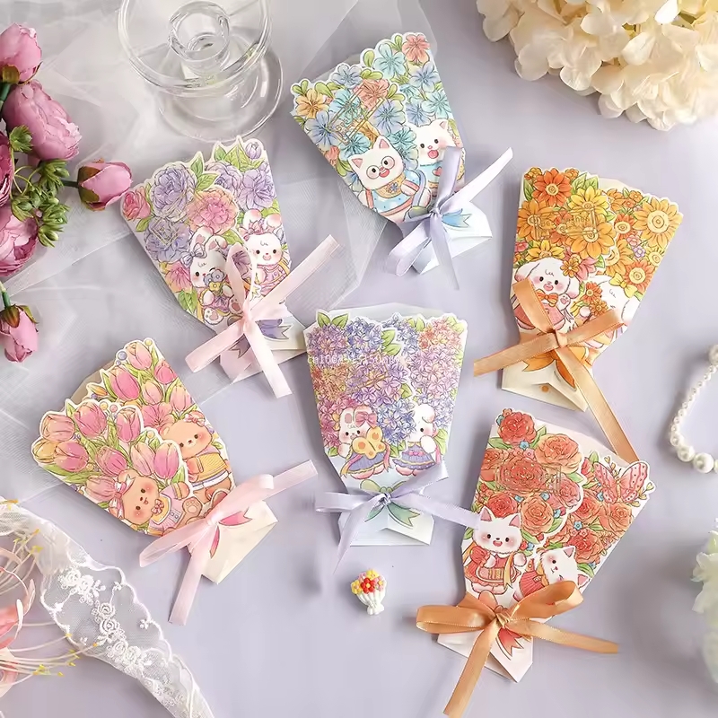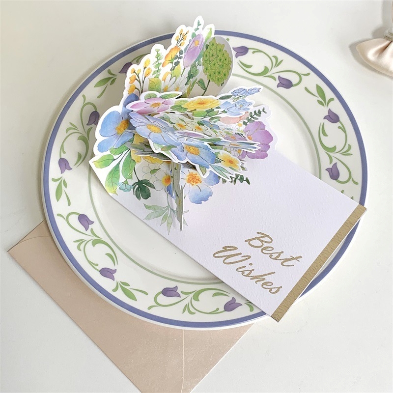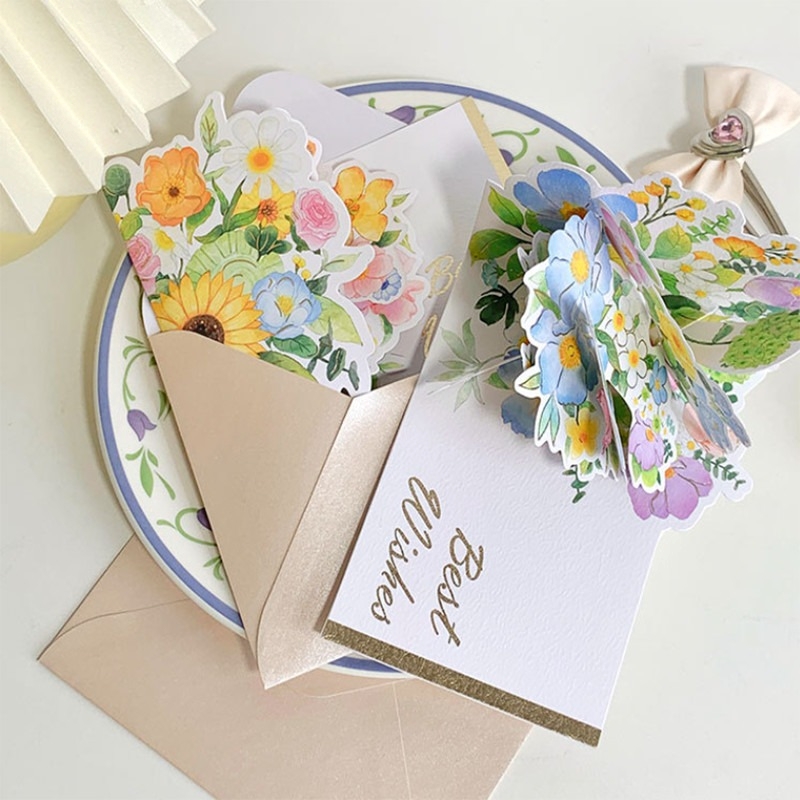 Thiệp chúc 8/3 kèm hoa: Hoa tươi kết hợp cùng thiệp chúc mang lại cảm giác nhẹ nhàng, phù hợp với những dịp tặng quà mang tính cảm xúc và cá nhân.