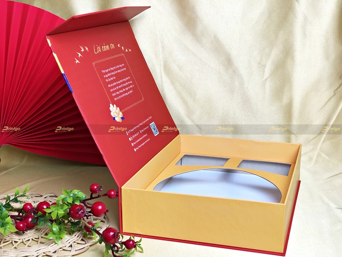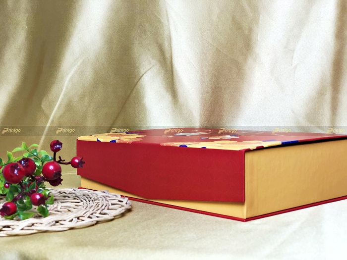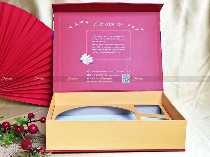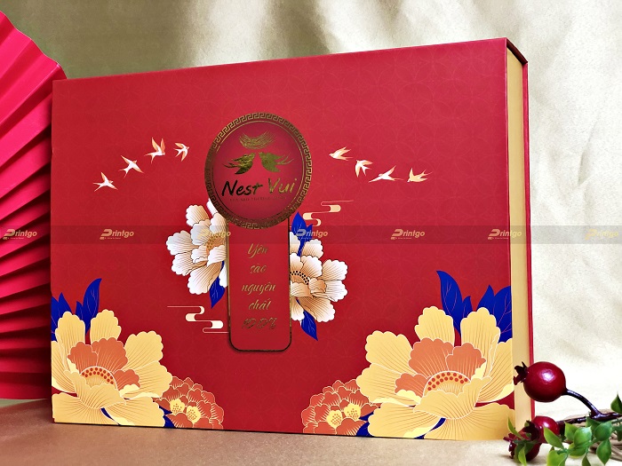 Sản phẩm có được hoàn chỉnh, thể hiện được hết những nét đẹp trên bản thiết kế hay không là nhờ vào phần lớn quá trình sản xuất và gia công sau in. Quy trình thực hiện in ấn hộp yến sào Nest Vui tiếp tục được Printgo phụ trách. Bao bì được sản xuất theo quy cách hộp nam châm cạnh, với vẻ ngoài sang trọng nhờ chất liệu và gia công. Hộp đựng yến Nest Vui có hình dạng vuông vức, cứng cáp với phần nắp được thiết kế có gắn nam châm, giúp việc đóng mở của người dùng để khám phá sản phẩm đựng bên trong được tiến hành một cách dễ dàng. Để tạo sự thuận tiện cho việc vận chuyển, làm quà tặng, phần đáy của hộp đựng yến sào Nest Vui được sản xuất với khay định hình theo chuẩn kích thước của ba hộp sản phẩm đựng bên trong, gồm hộp nhựa hoa mai đựng tai yến, hộp nhựa đựng đường phèn và táo đỏ. Việc phân chia khay định hình không những giúp cố định sản phẩm mà còn gia tăng tính thẩm mỹ và nâng tầm giá trị của món quà tặng. Đặc biệt, để tôn lên dáng vẻ vuông vắn, chắn chắn, không thể thiếu vai trò của chất liệu carton lạnh bồi giấy couche, vật liệu gia tăng tính thẩm mỹ giúp sản phẩm thêm sự sang trọng, cao cấp.