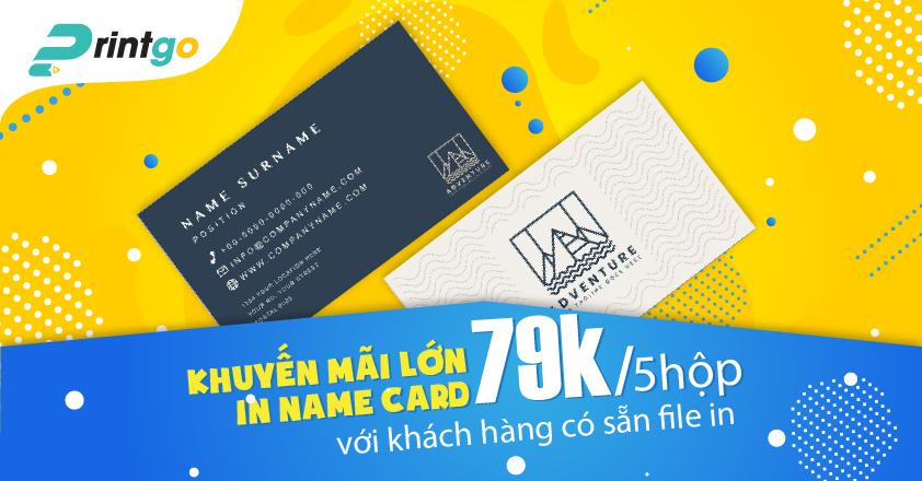 Printgo đang có gói khuyến mại 79k/5 hộp namecard vô cùng hấp dẫn dành riêng cho khách hàng thân thiết đã có file thiết kế. Gói khuyến mại áp dụng cho những mẫu card visit có chất liệu giấy C300, cán mờ 2 mặt và không bao gồm bo góc, ép kim, dập nổi,… và đã có sẵn những file in phù hợp với tiêu chuẩn của chúng tôi. Mọi thông tin chi tiết xin vui lòng liên hệ qua số điện thoại 1900.633.313 và sale@printgo.vn