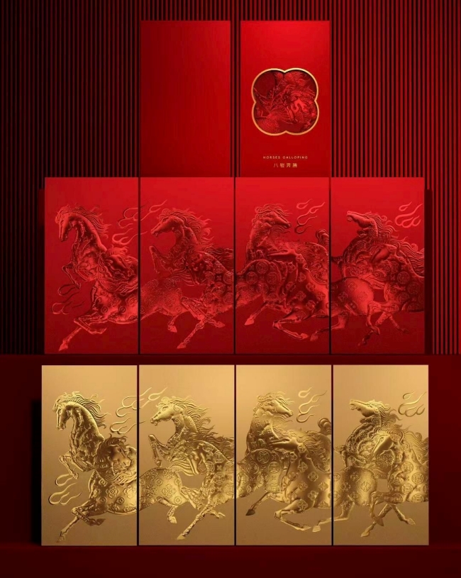 Những tấm thiệp in hình ngựa kết hợp phong cách thiết kế tối giản và kỹ thuật in nổi hoặc ánh kim, thể hiện sự sang trọng và lời chúc tinh tế từ thương hiệu đến đối tác.