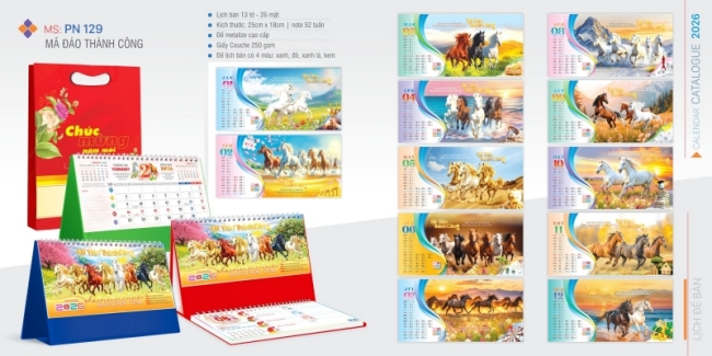 Dòng lịch bloc, lịch để bàn hoặc lịch treo tường được thiết kế với hình tượng ngựa cách điệu, thể hiện sức sống và chuyển động. Mỗi tháng là một thông điệp khích lệ, truyền cảm hứng cho hành trình mới.