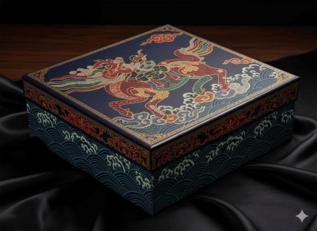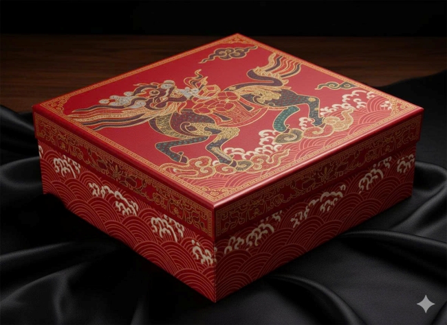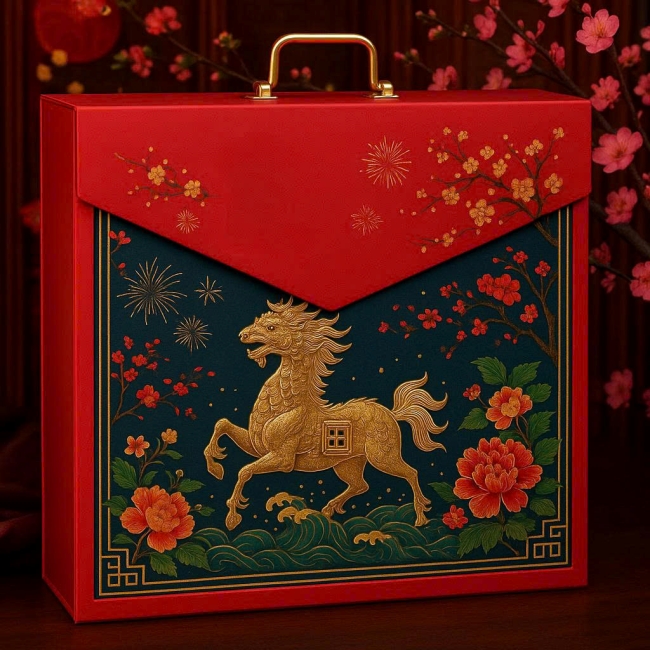 Thiết kế hộp quà mang hình ảnh ngựa phi nước đại, sử dụng hiệu ứng ép kim, cán mờ, hoặc dập nổi tinh xảo. Phù hợp cho các doanh nghiệp muốn gửi gắm tinh thần bứt phá và năng lượng tích cực đầu năm.