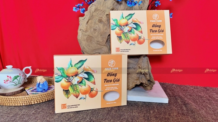 Khâu quan trọng nhất khi làm hồng treo gió chính là chọn nguyên liệu. Để có thể tạo ra những quả hồng treo gió dẻo mật, người ta phải lựa chọn kỹ càng những quả hồng này. Quả được chọn phải đáp ứng yêu cầu quả to vừa phải, khi đó quả hồng chuyển sang màu cam đỏ, có độ chính nhất định nhưng vẫn đảm bảo độ cứng. Vì vậy, hộp giấy đựng hồng treo gió Phan Farm đã được Printgo làm nổi bật với chùm hồng chín, căng mọng và đẹp mắt được vẽ bằng tay tỉ mỉ đến từng chi tiết. Màu cam đỏ cũng được hạ tone để làm màu sắc chủ đạo của hộp đựng, nhờ vậy khách hàng dễ dàng ghi nhớ sản phẩm của thương hiệu Phan Farm.