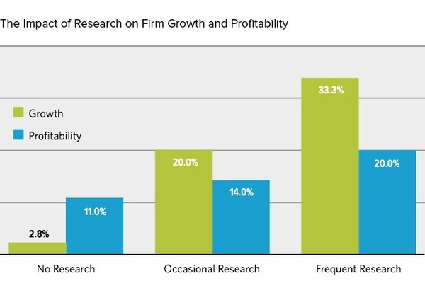 Một nghiên cứu thực hiện bởi Lee Frederikson cho thấy rằng các công ty có hệ thống nghiên cứu kỹ lưỡng về nhóm khách hàng mục tiêu thường phát triển nhanh hơn và có nhiều lợi nhuận hơn (xem hình bên dưới). Hơn nữa, những công ty thực hiện nghiên cứu thường xuyên hơn (ít nhất một lần mỗi quý) cũng có chỉ số phát triển nhanh hơn.