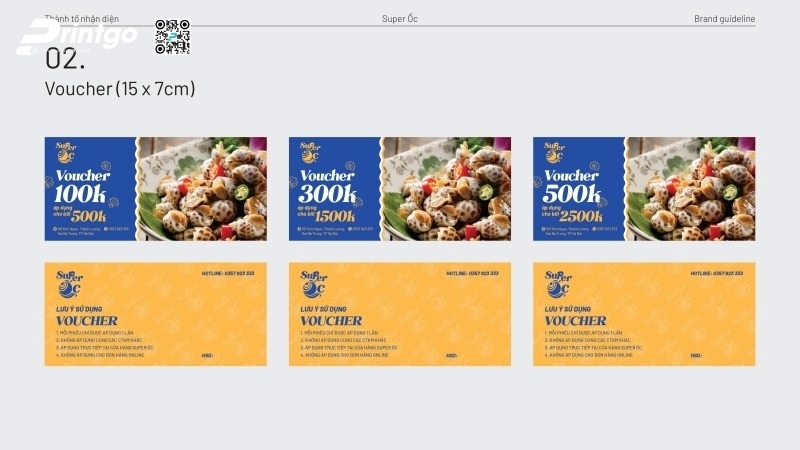 Bên cạnh chất lượng món ăn, cách thức truyền tải chương trình ưu đãi cũng đóng vai trò quan trọng trong việc thu hút khách hàng đến với quán. Chính vì vậy, Super Ốc đã lựa chọn sử dụng voucher giảm giá được thiết kế chuyên nghiệp nhằm gia tăng sức hút cho các chương trình khuyến mãi. Mẫu voucher được Printgo thiết kế và in ấn với bố cục rõ ràng, màu sắc nổi bật, giúp truyền tải thông tin ưu đãi một cách trực quan và dễ ghi nhớ. Không chỉ là một ấn phẩm khuyến mãi đơn thuần, voucher Super Ốc còn góp phần nâng cao hình ảnh thương hiệu và mang đến trải nghiệm chỉn chu hơn cho khách hàng ngay từ lần tiếp cận đầu tiên.