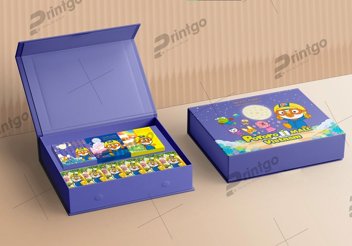 Để thu hút khách hàng làm nên sự độc đáo cho sản phẩm, Printgo đã lựa chọn quy cách hộp nam châm cạnh. Với thiết kế liền mạch, không chi tiết thừa giúp tăng tính thẩm mỹ và tạo nên sự sang trọng, lịch sự, đáp ứng nhu cầu làm quà biếu, tặng của khách hàng. Hộp cũng dễ dàng thao tác, giúp các em nhỏ có thể tự lấy những chiếc bánh thơm ngon để thưởng thức.