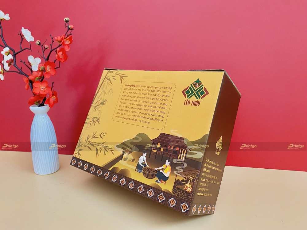 Để đáp ứng nhu cầu của thị trường về một sản phẩm chất lượng cao cấp với nguồn gốc xuất xứ rõ ràng, không chỉ để sử dụng cho nhu cầu của gia đình mà còn có thể trở thành một món quà biếu tặng trong dịp tết, bên cạnh việc thiết kế logo, nhận diện thương hiệu, thương hiệu còn thiết kế và in hộp đựng thịt sấy Lèo Thuý. Đồng nhất với thiết kế nhận diện thương hiệu, trong bao bì này cũng được khai thác triệt để các yếu tố liên quan đến bản sắc của dân tộc Thái cho đến đặc trưng của sản phẩm.