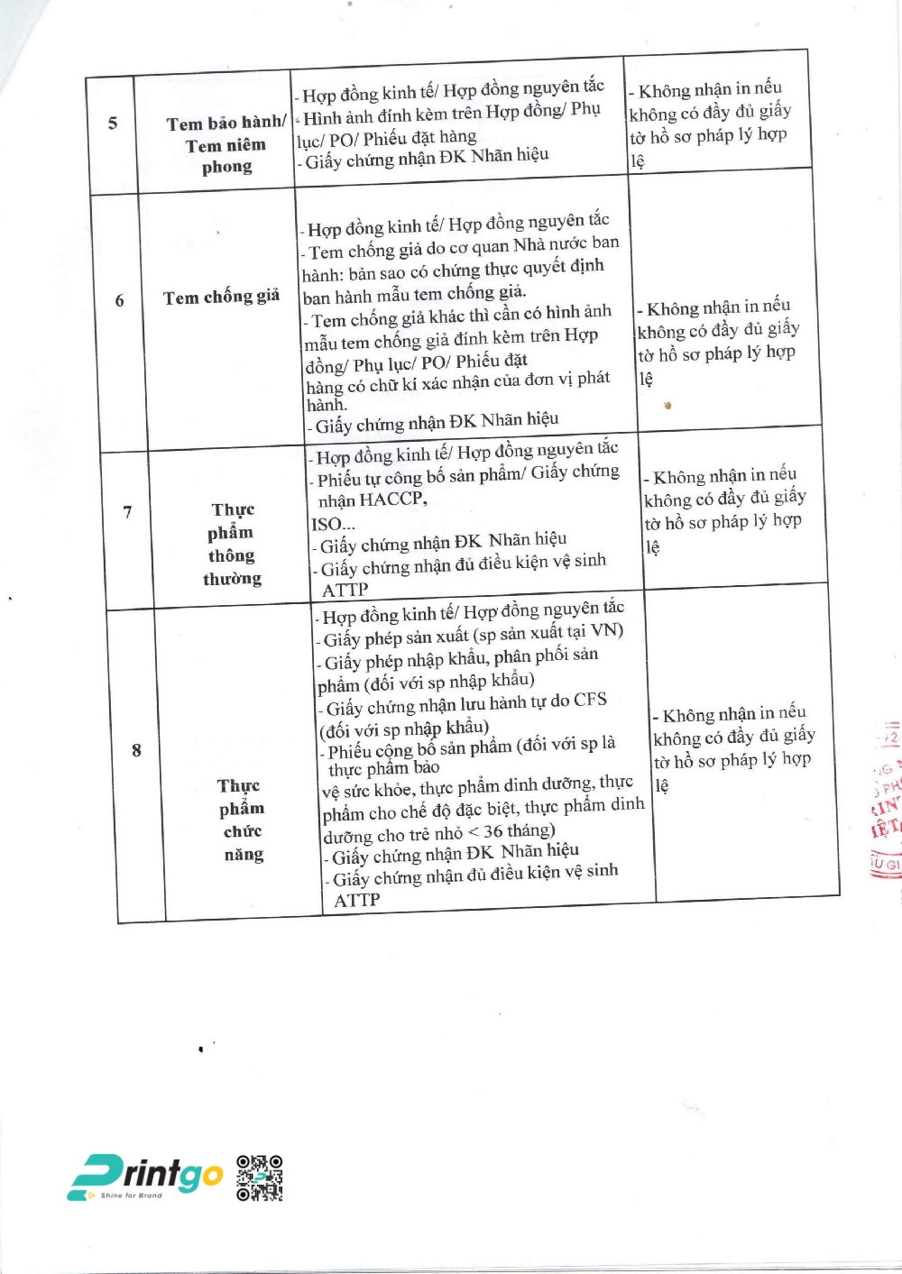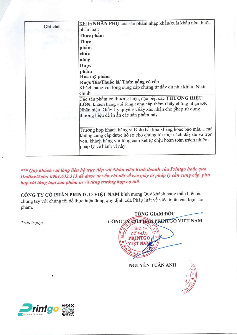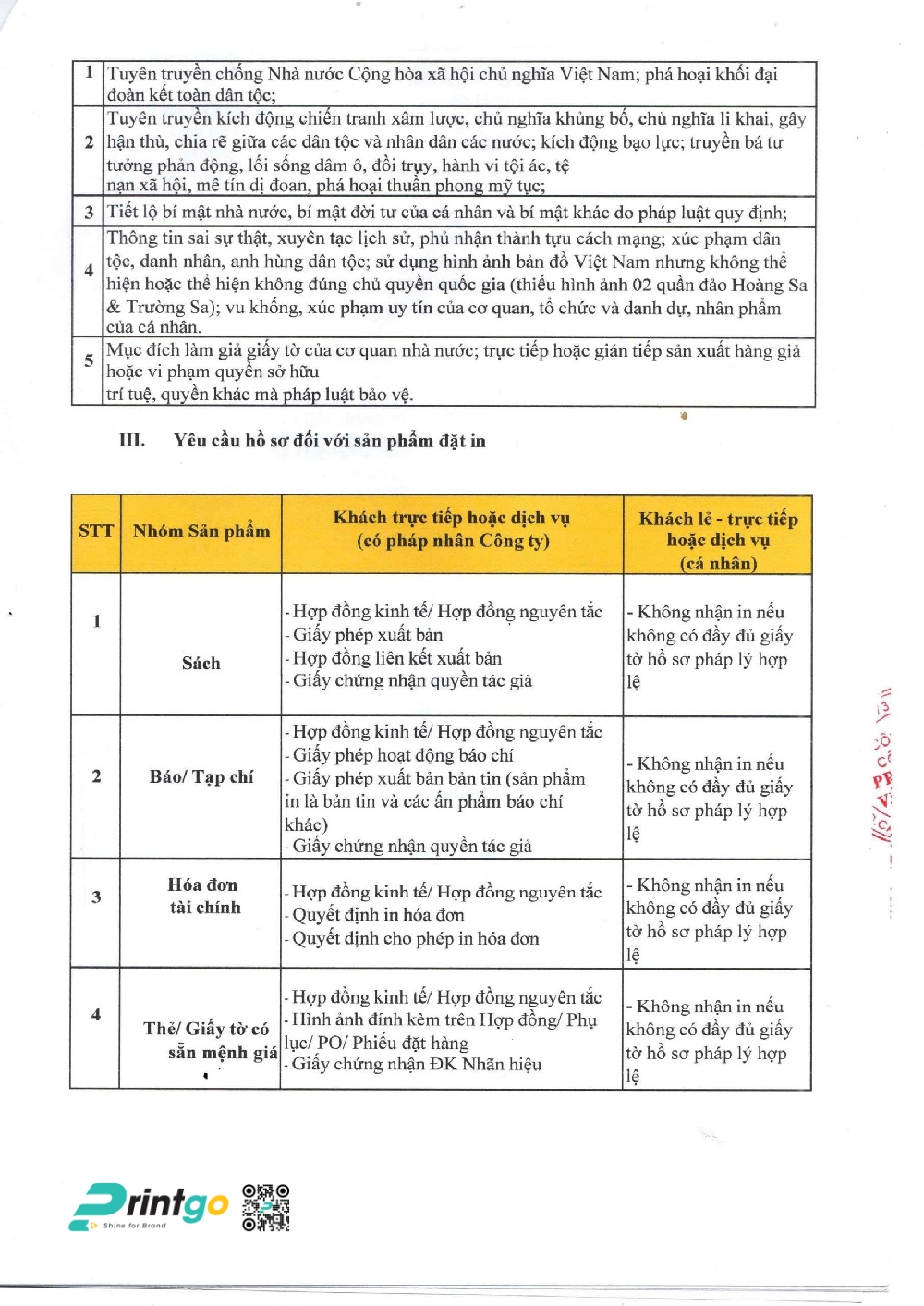 - Trường hợp khách hàng không thể cung cấp đủ hồ sơ do bảo mật, cần cam kết hoàn toàn chịu trách nhiệm pháp lý liên quan đến nội dung in.