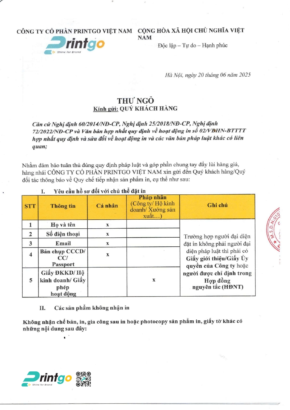 Quý khách vui lòng liên hệ với chúng tôi qua Hotline/Zalo: 0901.633.313 để được tư vấn chi tiết về các giấy tờ pháp lý cần cung cấp, phù hợp với từng loại sản phẩm in và từng trường hợp cụ thể. Thông qua Quy chế tiếp nhận sản phẩm in ấn, Printgo không chỉ thực thi trách nhiệm pháp lý mà còn thể hiện cam kết mạnh mẽ trong việc xây dựng môi trường in ấn minh bạch – an toàn – chuyên nghiệp. Rất mong tiếp tục nhận được sự đồng hành và hợp tác nghiêm túc từ Quý khách hàng trong hành trình lan tỏa giá trị thật – nói không với hàng giả, hàng nhái.
