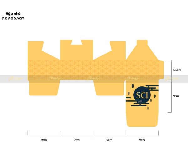 Nổi bật phía trên chính là hình ảnh ánh trăng tròn đầy đặn, đang chiếu xuống bầu trời đêm khiến mọi thứ trở nên nhuộm vàng. Logo công ty SCI được làm nổi bật trên nền vàng. Thiết kế hiện đại, đơn giản nhưng mang lại vẻ đẹp sang trọng sẽ là món quà sang trọng thể hiện sự chu đáo của công ty. Printgo tin rằng, khi những người thân của nhân viên SCI nhận được những hộp bánh này sẽ rất cảm động. Họ sẽ tạm nguôi đi nỗi nhớ, trở thành hậu phương vững chắc để nhân viên SCI có thể yên tâm làm việc, góp phần nối dài thêm chặng đường phát triển của SCI Group qua những công trình đi cùng năm tháng.