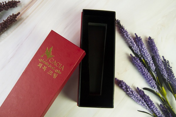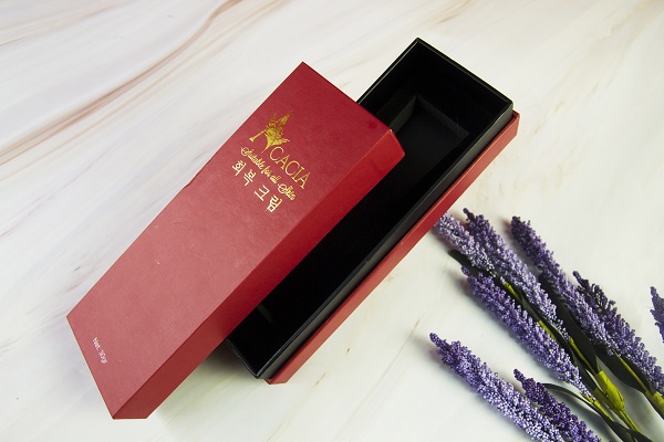 Hợp đựng mỹ phẩm của ACACIA được thiết kế khá đơn giản với tông màu đỏ nhưng vẫn toát lên sự sang trọng, cao cấp nhờ tên logo thương hiệu được ép kim vàng nổi bật, giúp khách hàng nhận biết thương hiệu. Ngoài ra, kiểu hộp âm dương có thành và có khay đỡ lót nhung cũng là một trong những loại hộp cao cấp luôn được lựa chọn để đựng những món quà hay sản phẩm sang trọng. Việc thiết kế hộp đựng mỹ phẩm đẹp, ấn tượng và chất lượng của ACACIA có thể thấy sự đầu tư, chú trọng vào bao bì sản phẩm của ngành hàng mỹ phẩm ngày càng cao. Vì vậy, việc thiết kế và in hộp đựng mỹ phẩm là việc làm cần thiết mà các thương hiệu mỹ phẩm cần thực hiện.