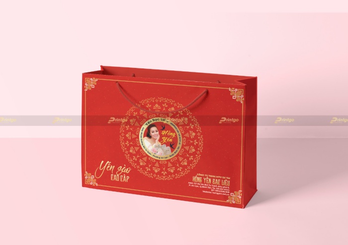Túi giấy hộp đựng yến sào Hồng Yến Bạc Liêu kích thước 39x35x9 cm làm bằng giấy Ivory định lượng 200, cán mờ. Giấy Ivory có độ bền cứng khá tốt, chịu được lực va đập nhẹ, phù hợp với nhiều công nghệ in khác nhau cho hình ảnh và họa tiết minh họa hiển thị rõ nét. Phần quai túi làm bằng dây dù bóng chắc chắn, người sử dụng dễ dàng xách tay hoặc cầm nắm trong quá trình di chuyển