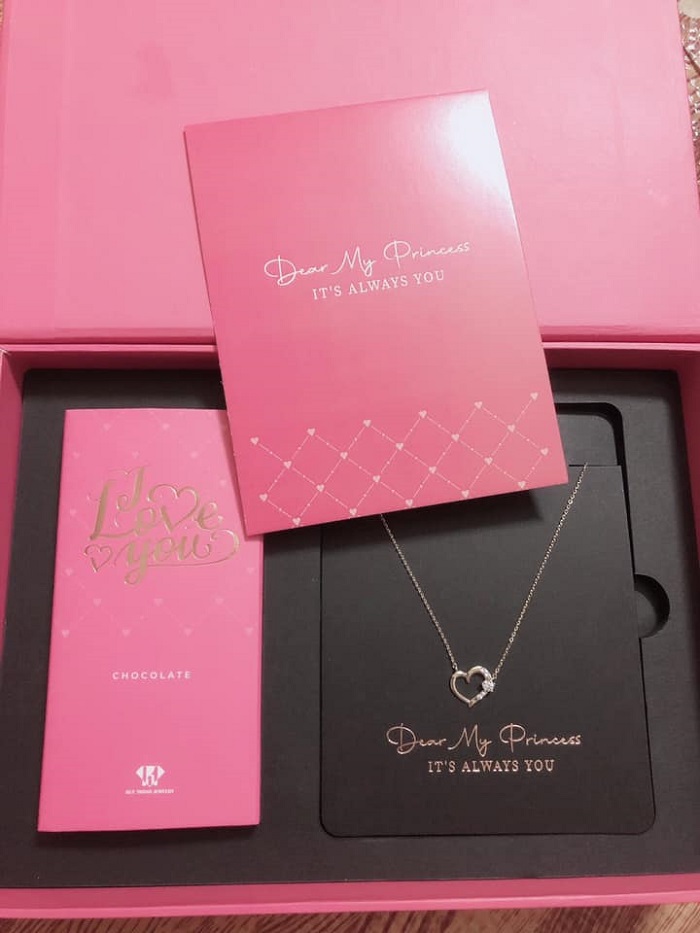 Ngoài phần vỏ, bên trong mẫu hộp Huy Thanh Jewelry còn có một hộp đựng socola và một tấm thiệp cảm ơn của thương hiệu. Hai ấn phẩm này đều sử dụng màu sắc tương đồng với phần hộp phía ngoài, tạo sự đồng nhất cho tổng thể thiết kế. Hộp Socola với cụm chữ “I love you” thay cho lời yêu thương chân thành của người trao quà tới người nhận. Không chỉ có công dụng bảo quản trang sức, thông qua mẫu hộp này, Huy Thanh Jewelry còn quảng bá hình ảnh thương hiệu với phần logo đính kèm trên mỗi chiếc hộp đựng socola. Bên cạnh chất lượng gia công, nhìn chung, thiết kế hộp Huy Thanh Jewelry luôn đảm bảo tính thẩm mỹ, tạo sự chuyên nghiệp và khẳng định đẳng cấp cho thương hiệu vàng bạc đá quý đình đám này.